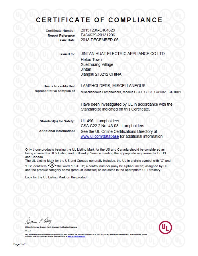UL證書 G9 GU10 E464629
