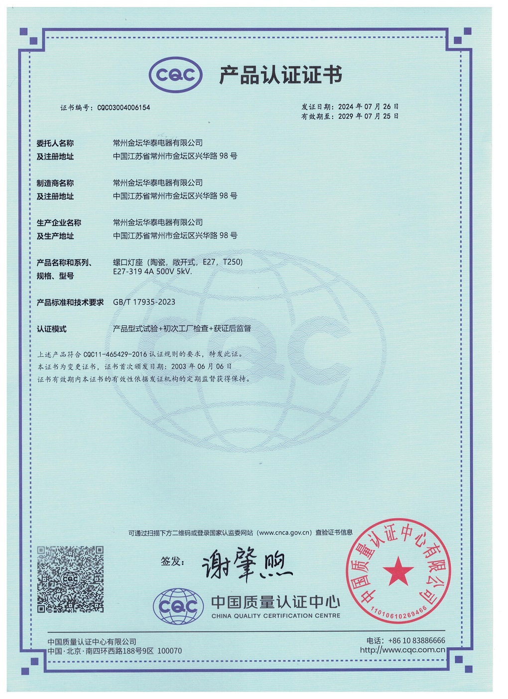 CQC證書螺口燈座E27-319英文版