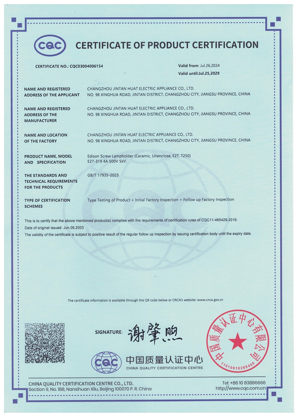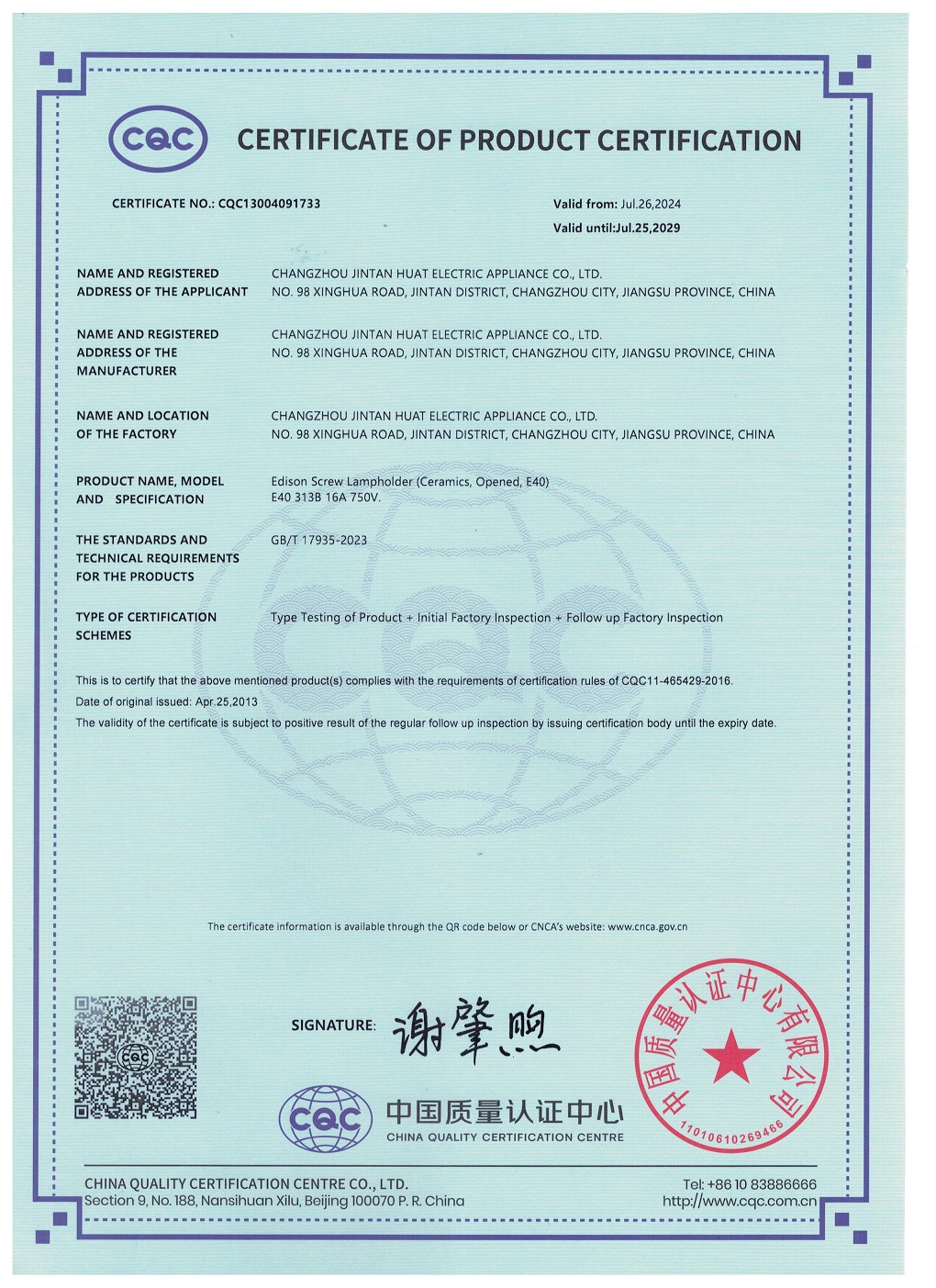 CQC證書螺口燈座E40 304 307 313英文版