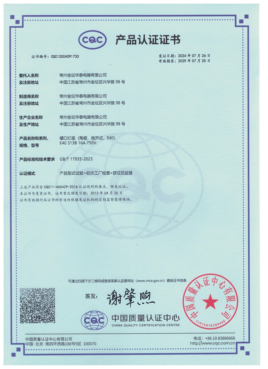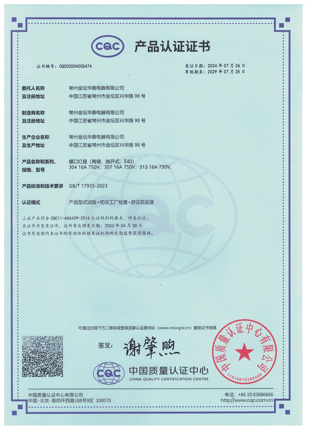 CQC證書螺口燈座E40 304 307 313中文版